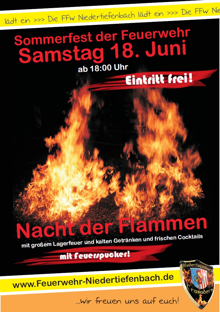 Beselich-Niedertiefenbach. Das Sommerfest der Freiwilligen Feuerwehr Beselich-Niedertiefenbach e.V. war auch in diesem Jahr ein voller Erfolg. Sowohl am Samstag bei der „Nacht der Flammen“ als auch am Sonntag konnte sich die Wehr über viele Besucher freuen. Das Sommerfest etabliert sich damit immer mehr als fester Bestandteil im Niedertiefenbacher Veranstaltungskalender.Glücklicherweise spielte an beiden Tagen das Wetter mit. Der befürchtete Regen blieb aus. Die Gemeinschaftsübung der Jugendfeuerwehr und der Einsatzabteilung zu Beginn der Nacht der Flammen verlief reibungslos. Am Abend konnten sich die Besucher am großen Lagerfeuer w&aum;rmen und frisch zubereitete Cocktails und anderen Getränke genießen. Der Feuerspucker war für Jung und Alt eine Attraktion.