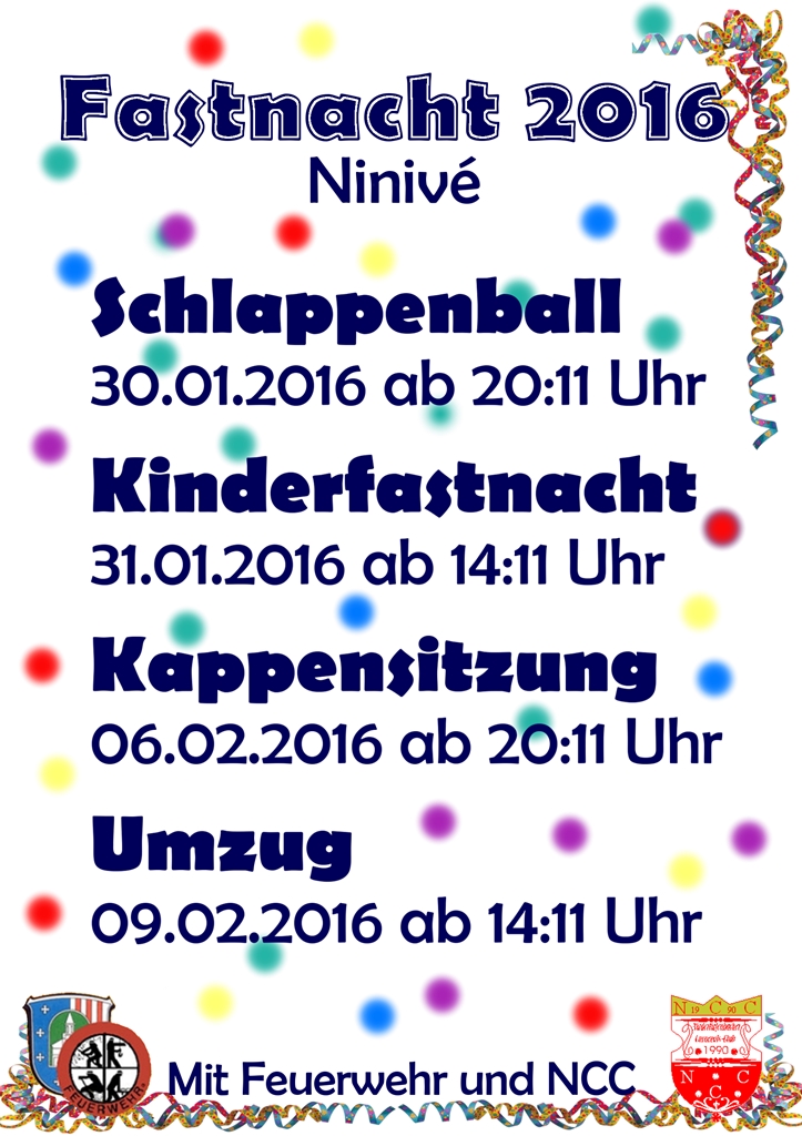 Die Freiwillige Feuerwehr Niedertiefenbach sowie der NCC mit seiner Prinzessin Mareike I. freuen sich auf viele Gäste an den Veranstaltungen in Ninivé. Für das leibliche Wohl ist natürlich jeweils gesorgt.
