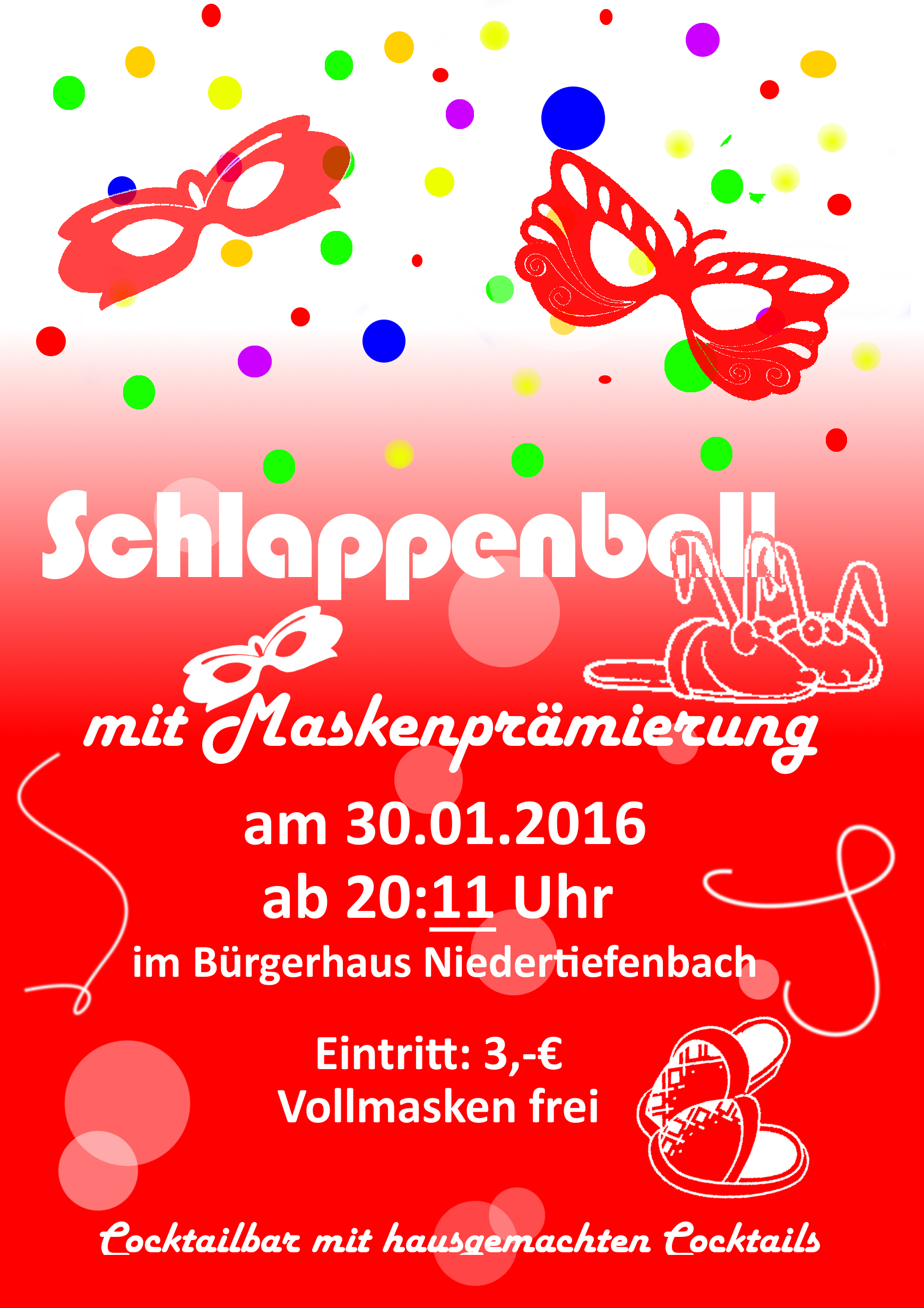 Beselich. Unter dem Motto „Feuer und Flamme für die Fastnacht“ richtet die Freiwillige Feuerwehr Beselich-Niedertiefenbach e.V. die diesjährige Fastnachtskampagne aus – natürlich mit der bewährten Unterstützung des Niedertiefenbacher Carnevals Clubs (NCC), der 2016 von Prinzessin Mareike I. regiert wird.Folgende Termine stehen auf dem Programm: Am Samstag, dem 30. Januar 2016, findet im Bürgerhaus, der närrischen Hochburg von Niedertiefenbach, ab 20.00 Uhr der „Schlappenball“ statt. Der Eintritt beträgt 3,00 Euro. Voll maskierte Gäste erhalten freien Eintritt. Die drei schönsten Masken (Gruppen oder Einzelpersonen) werden prämiert. Natärlich werden anlässlich des Schlappenballs wieder die leckeren, frisch zubereiteten Cocktails in der Cocktailbar gemixt, die sich stets großer Beliebtheit erfreuen.